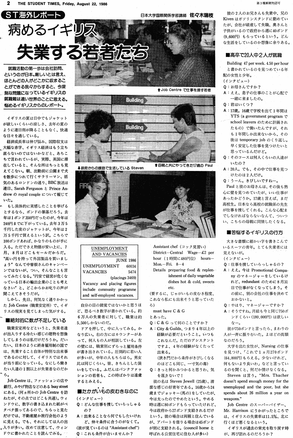 | 就職活動の第一歩は会社訪問、というのが日本.厳しいとは言え、ほとんどの人がどこかに収まることができる我々からすると、今深刻な問題になっているイギリスの就職難は遠い世界のことに思える。 悩めるイギリスからのレポート イギリスの夏は日中でもジャケットが欲しいくらいの涼しさ、去年の夏のように連日雨が降ることもなく、快適な日々を過している。 経済成長率は伸び悩み、国際収支は大幅な赤字、イギリス経済はもう立ち直らないのではないかなどと、あちこちで言われているが、実際、英国に滞在していると、そんな所はちっとも見えてこない。朝、出勤前に公園まで犬を散歩につれて行くサラリーマン、活気のあるロンドンの通り、BBC放送は連日、Sarah FergusonとPrince Andtewのroyal coupleにづいて報じていた。 もし具体的に実感したことを挙げるとするなら、ポンドの暴落だろう。去年は1ポンド350円だったのが、今年は240円までに下がっている。去年3万5千円した皮のジャケットが、今年は2万5千円で買えるという訳。こちらで100ポンドあれば、かなりのものが手に入る。ただでさえ物価が安い上に、7月、8月はどこもセールだからだ。 ”高い円を持って外国製品を買いましょうかなんて中曽根さんのキャンペーンではないが、つい、そんなことも言ってみたくなる。”円安で経営が危くなっている日本の輸出企業のことも考えなさい”と、どこからかお叱りの声が聞こえてきそうだが。 しかし、先日、何気なく通りかかったJob Centre(職業安定所)で、イギリスの現実を見てしまった気がする。 ■絶対的に数が不足している 職業安定所などというと、失業者達が出入りする冷たい感じの建物を想像してしまうのは私だけだろうか。だいたい、日本のように終身雇用制の国では、失業すること自体が特別な出来事であるのに対して、イギリスではそれが当り前になっている。なにしろ働きたい人達の、1割以上が失業者なのだから。 Job Centreは、ファッションの店や銀行、みやげ物店などのあるbusy streetにある。(何カ所かのJob Centreを訪ねたが、その点ではどこも共通)。ウインドウに、数字の書き込まれた紙がべタベタ張ってあるので、ちらっと見ただけでは、不動産屋か旅行会社のように見える。でも、それにしては人の出入りが多い。改めて注意して、ウインドゥに書かれたことを読んでみる。 自分の目の錯覚ではないかと思うほど、恐るべき数字が書かれている。約6万人の失業者に対して、職業は約5,500しかないのだ。 ドアを押して、中に入ってみる。かなり広い。右の方にはカウンターがあって、何人もの人が相談している。左の壁には、職業別にずらっと雇用条件が書き出されている。圧倒的に若い人が多いが、中年の人もちらほら。男女比は同じくらい。皆、きちんとした装いをしている。ふだんはパンクファッションの若者も、この時ばかりは遠慮するとみえる。 ■たかがいもの皮むきなのに (インタビュー) Q:どんな仕事を捜していらっしゃるの? A:出来ることなら何でもしたいけれど、仲々条件に合うのがなくて。 (彼が見ているのは“Assistant chef”) Q:これも条件が合いませんか? Assistant chef(コック見習い) District-Central Wage-£2 per hour(1時間に480円位) hours-Mon.-Fri.8-4 Details prdparing food & replenishment of daily vegetable dishes hot & cold, SWeets etc. (要するに、じゃがいもの皮むき程度、これなら私にも出来そうと思っていたら) must have C & G とあった。 Q:C&Gって何のことですか? A:City & Guilds、つまり4年以上の経験が必要だということ。いつもこれなんだ。ただのアシスタントですよ、4年の経験がなくたって出来る? (狭き門だから条件がきびしくなるのはどこも同じ、一寸気の毒) Q:きっと何かみつかると思うわ、気を落さないで! 彼の名はSteven Jewell(25歳)、清潔な感じの好青年である。16歳から24歳までジョッキー(馬の)をしていたが、今は太ったのでやめたという。やめる時は週に80ポンドもらっていたけれど、今は政府から27ポンド支給されるだけという。彼の場合は両親と住んでいるが、アパートを借りる場合は45ポンドが別に支給される。(council homeと呼ばれる公営住宅に住む人が多い) 彼の2人のお兄さんも失華中、兄のKivenはガソリンスタンドに勤めていたが、会社が破産して失職、奥さんと子供がいるので政府から週に40ポンド(9,600円)もらっているという。どんな生活をしているのか想像に余りある。 ■高卒で20人中2人が就職 Building 47 per week.4.50 per hour と書かれているのを見つめている年配の女性と少年。 (インタビュー) Q:お母さんですか? A:ええ、息子の仕事のことが心配で一緒に来ましたの。 Q:君はいくつ? A:17歳。16歳で学校を出て1年間はYTS (a government programでschool leaversのために計画されたもの)で働いたんですが、それも1年間しか出来ないから、その後はtemporary jobのくり返し。 早く安定した仕事を見つけたいと思っているんだけど。 Q:そのコースは何人くらいの人達がいたの? A:20人。でも、その中で仕事を見つけたのは2人