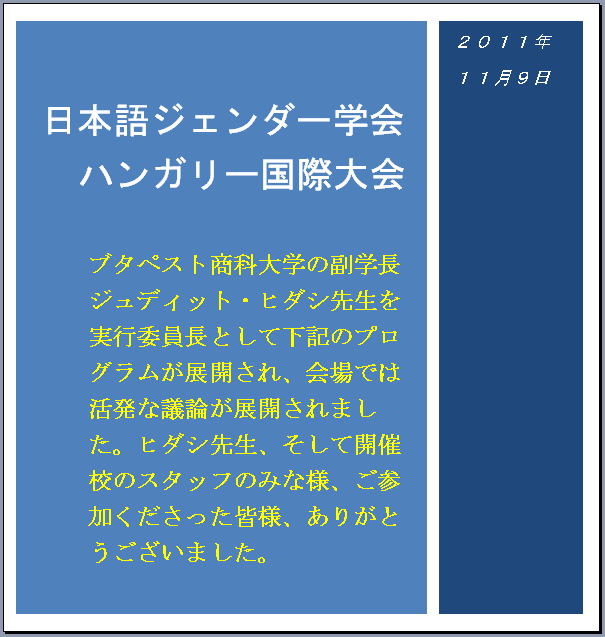 | Sasaki-sensei, thank you very much for your efficiency in making a lovely photo-album out of the photos! It is going to be a nice memory for all of us...... The feedback of the Gender-Symposium was very good - and many people were surprised to find out that Gender studies is at such an advanced level in Japan! No doubt, the NihongoGenderGakkai has contributed a lot to its progress....We here in huingary were proud to be part of the GenderSymposium! Looking forward to our next meeting at some part of the world, with thankful greetings: dr. Judit HIDASI dean Budapest Business School Faculty of International management and Business Diosy Lajos str.22-24 / Budapest 1165 Hungary |