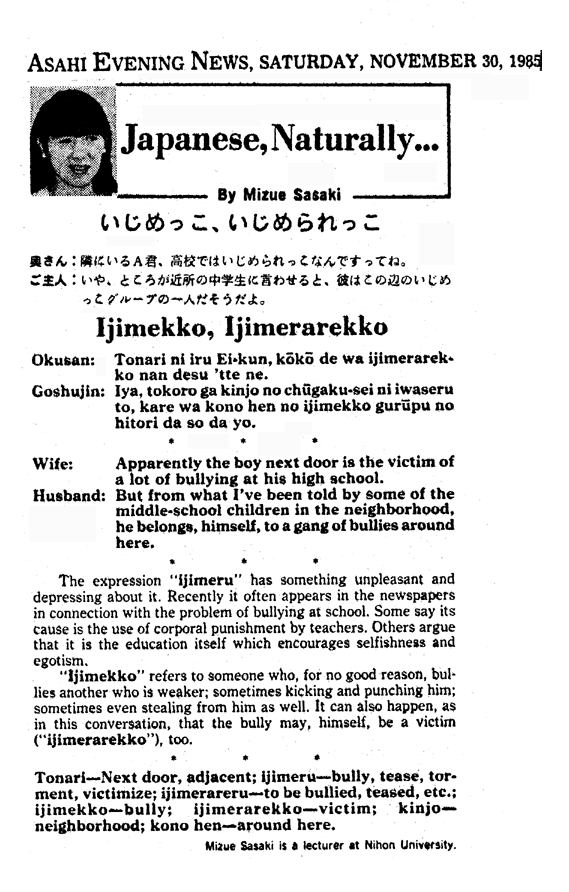 The expression "ijimeru" has something unpleasant and depressing about it. Recently it often appears in the newspapers in connection with the problem of bullying at school. Some say its cause is the use of corporal punishment by teachers. Others argue that it is the education itself which encourages selfishness and egotism.