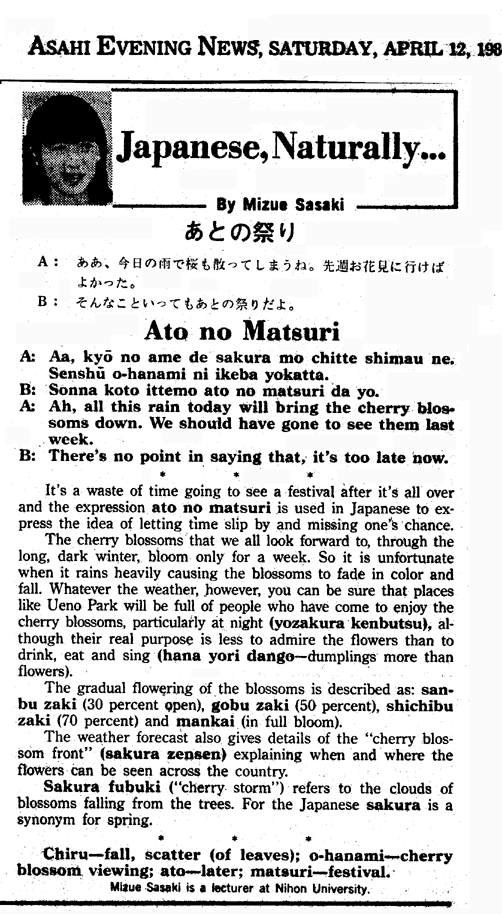 It's a waste of time going to see a festival after it's all over and the expression ato no matsuri is used in Japanese to express the idea of letting time slip by and missing one's chance.